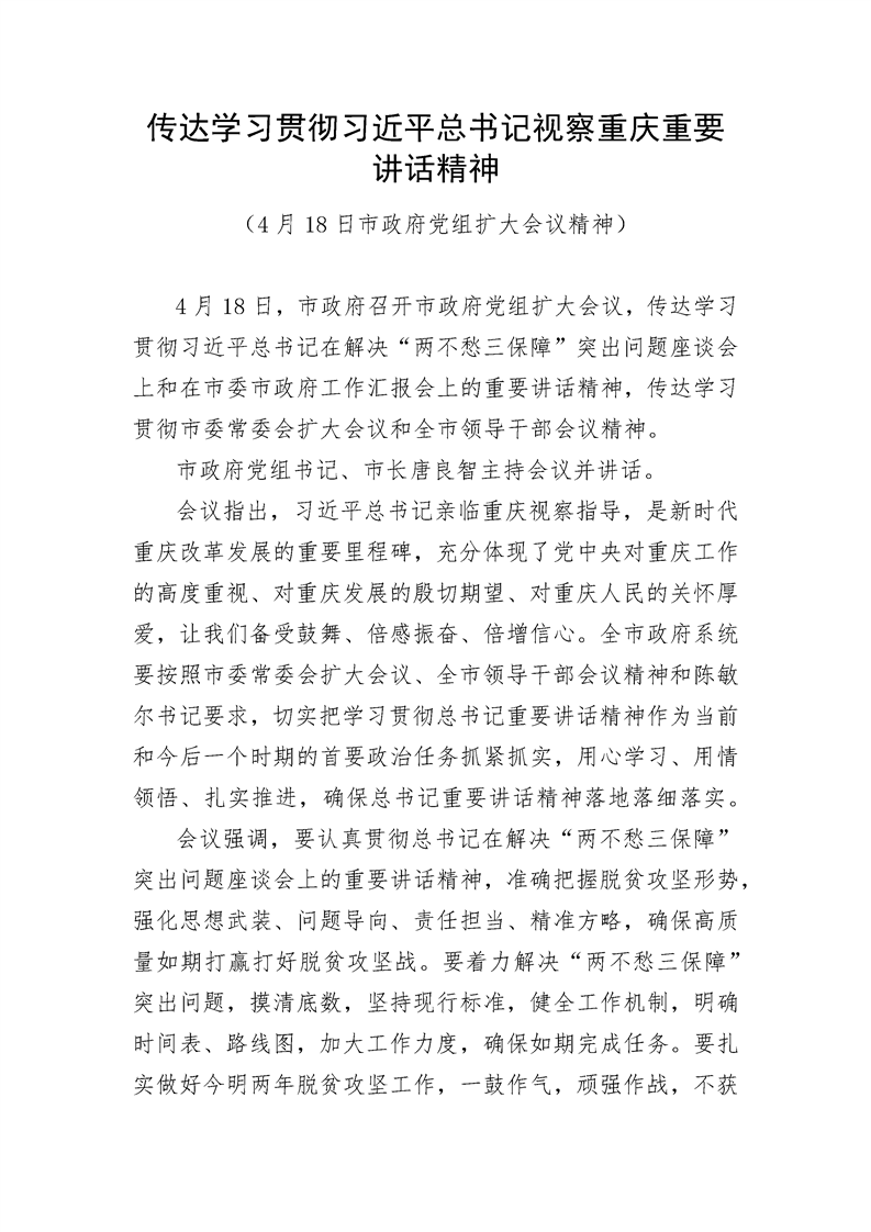 市政府党组扩大会议传达学习贯彻习近平总书记视察重庆重要讲话精神