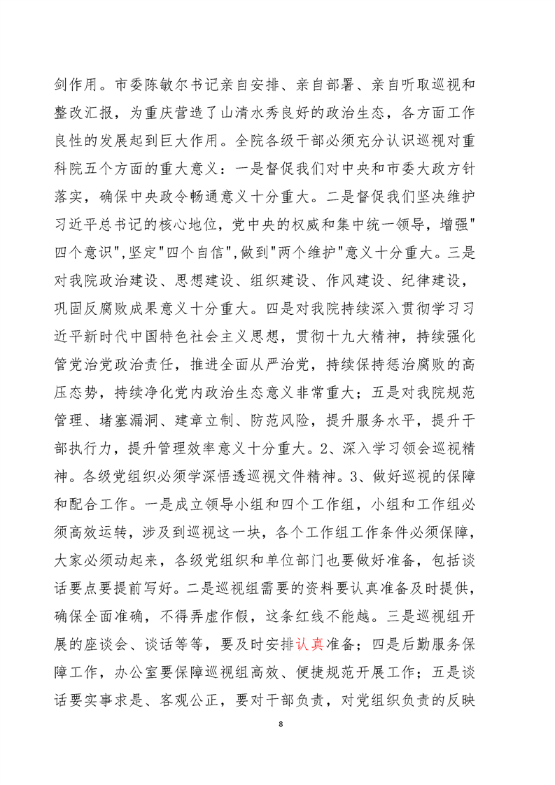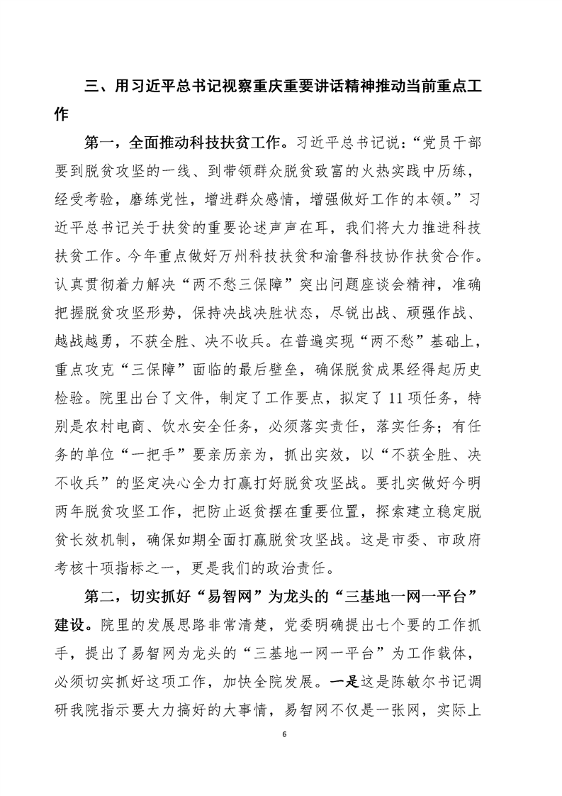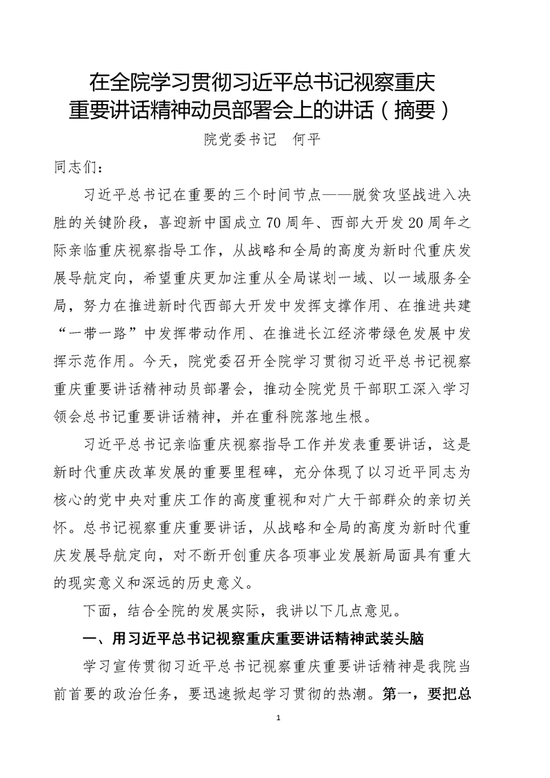 动员部署-党委书记何平在全院学习贯彻习近平总书记视察重庆重要讲话精神动员会上的讲话(摘要2019.5.9)
