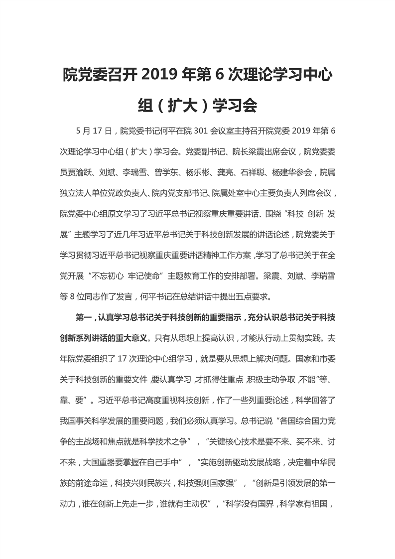 重科院党委2019年第6次理论学习中心组(扩大)学习会新闻(摘要)