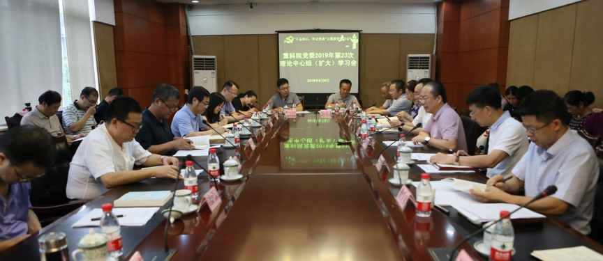 9月6日,何平书记在院301会议室主持召开院党委2019年第23次理论学习中心组(扩大)学习会。党委副书记、院长梁震出席会议,党委委员刘斌、曾学东、龚亮、石祥聪、杨建华,院属各单位党政主要负责人、机关各党支部书记、各处室(中心)、单位主要负责人等参会。会议学习了《中国共产党党内重要法规汇编》中关于中国共产党廉洁自律准则、中国共产党纪律处分条例、中国共产党问责条例、领导干部干预司法活动、插手具体案件处理的记录、通报和责任追究规定等内容,学习了习近平在深入推动长江经济带发展座谈会上的重要讲话,传达学习了陈敏尔书记在市委常委“不忘初心、牢记使命”专题民主生活会上的讲话精神,学习了干部选拔任用条例、市委关于进一步激励广大干部新时代新担当新作为的实施意见,传达了市科技局宣传及意识形态专题会精神。刘斌,杨建华、陈晖同志中心发言,于明政等同志现场即席发言。