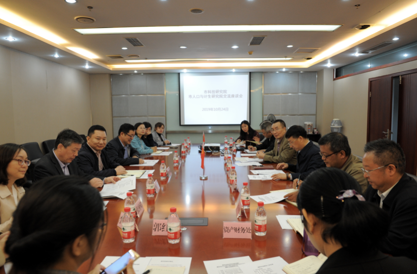 10月24日上午, 市计生研究院党委书记黄邦成、院长罗勇一行9人来院调研,党委副书记、院长梁震会见来宾,副院长刘斌及党建工作处、科研管理处、干部人事处、办公室、资产管理处、重科智谷建营办相关负责人参与座谈。