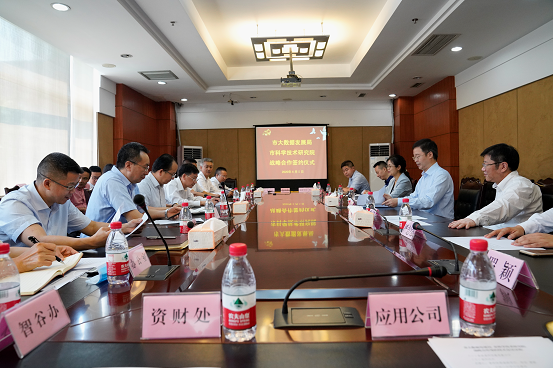 6月5日,市大数据发展局与我院在院301会议室签署战略合作协议。院党委书记何平、市大数据发展局局长罗清泉出席签约仪式并分别致辞,院党委副书记、院长梁震主持签约仪式,刘斌副院长和李斌副局长代表双方签署协议,双方领导见证签约。市大数据发展局副局长杨帆,数字重庆公司总经理严志强,我院副院长李瑞雪,纪委书记曾学东以及市大数据发展局相关处室,院相关处室、中心和战略研究院、大数据院主要负责人参加仪式。