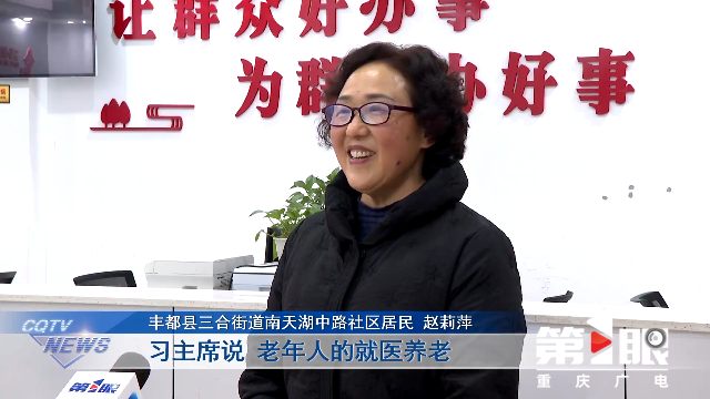 丰都县三合街道南天湖中路社区居民赵莉萍讲到,习主席说,老年人的就医养老,是家事也是国事,大家要共同努力,把这些事办好。这说明国家时刻把大家装在心里,记挂着大家的生活冷暖。