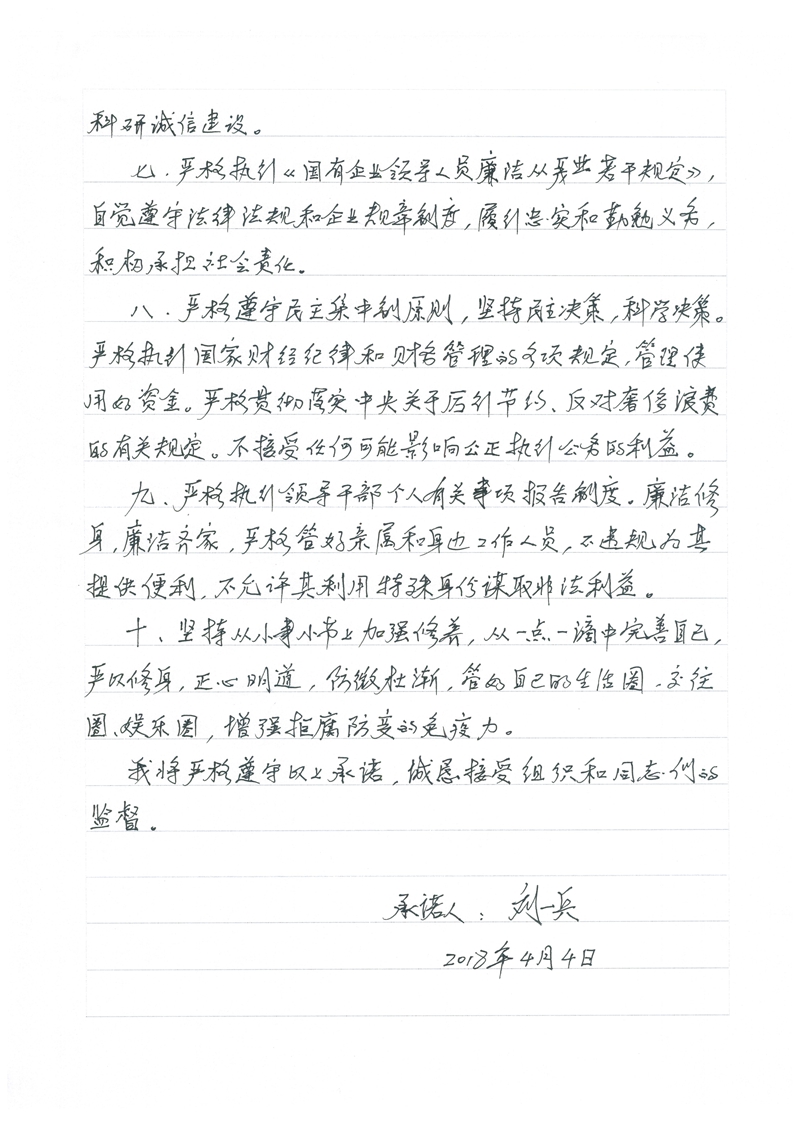 刘一兵廉政承诺书