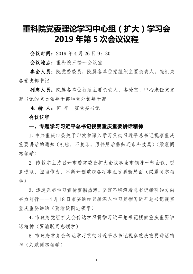 重科院党委2019年第5次理论学习中心组(扩大)学习会会议议程
