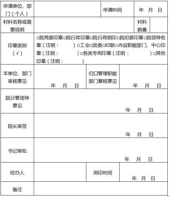 各院所(中心)印章的刻制,应提交刻章请示,由院分管领导审核同意,报院主要领导审批同意,刻章单位自行办理刻制,分别交院办公室和市应用技术公司备案。