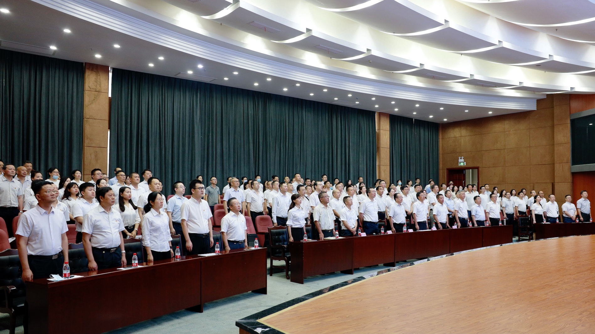 全场党员干部职工与天安门广场民众一道,起立肃穆、同唱国歌。大家专注聆听习近平总书记重要讲话,一起重温党团结带领全国各族人民在艰难困苦中奋起、在艰辛探索中前进,完成民族独立和人民解放的历史任务,建立社会主义制度,开创中国特色社会主义伟大事业,创造中华民族发展史上最辉煌的业绩。观看现场不时暴发热烈掌声。