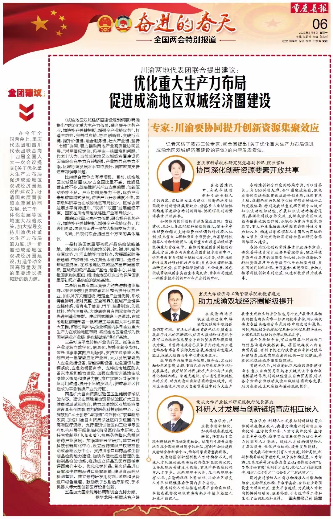 为此,重庆晨报记者采访了我市三位专家,就全团提出《关于优化重大生产力布局促进成渝地区双城经济圈建设的建议》的内容发表看法。院党委副书记、院长雷虹接受采访,以下为采访内容。