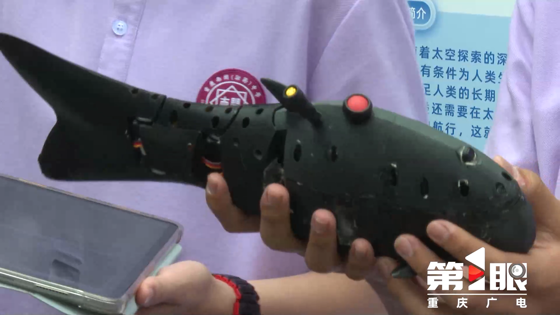 初中组金奖学生慕奕辰说,这个仿生鱼是基于舵机旋转时产生相位差,从而推动整个鱼体前进。由于给它安装了图像传感器,可以在水中回传图像给电脑,电脑再通过AI识别,把鱼群识别出来,这样就可以实时监测鱼群情况。
