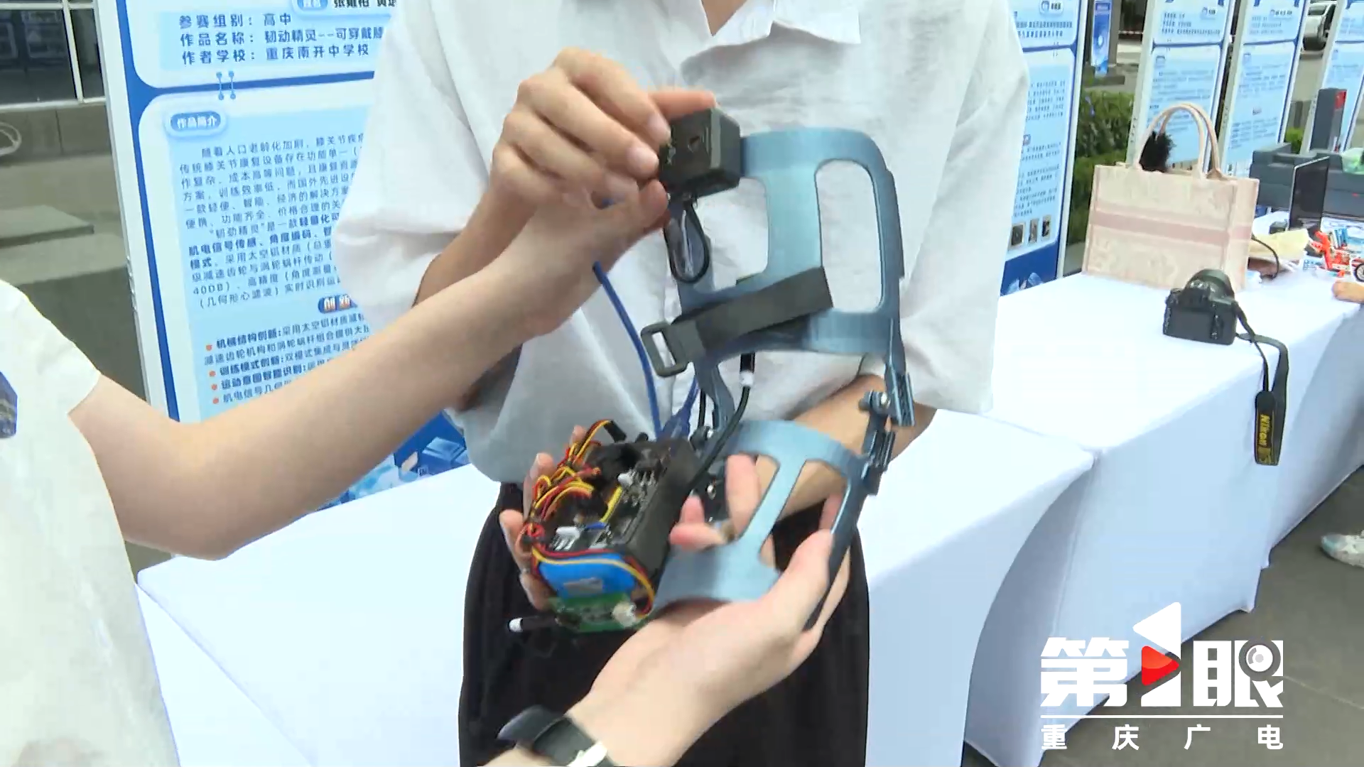 高中组金奖学生张雍柏说,它会采集腿部的肌电信号,当它了解到我们想运动腿的时候,会辅助小腿抬起,来帮助起立或者日常训练康复。另外,在登山走路的时候,可以辅助前行,更加节省体力。