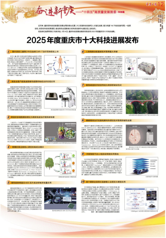 2025年度重庆市十大科技进展包括:国内首款儿童青少年白血病CAR-T治疗药物获批上市、首款全国产超高速图像传感器研制成功并实现应用、跨组织多细胞模块理论为精准免疫治疗提供新依据、柑橘抗黄龙病核心调控机制成功揭示、高性能射频直采ADC芯片成功研制并批量应用、人体胸腺功能重建技术取得重大突破、数智建造技术改变传统大跨拱桥建设范式、癫痫精准治疗的脑电解码和调控技术取得突破性进展、天枢智能平台L3级自动驾驶应用落地、首个钢铁全流程亿级参数工业视觉大模型应用。